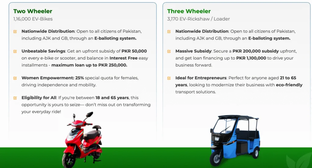 | Phase 1 Distribution (2025–26) | 40,000 Electric Bikes, 1,000 Rickshaws, 1,000 Three-Wheelers |